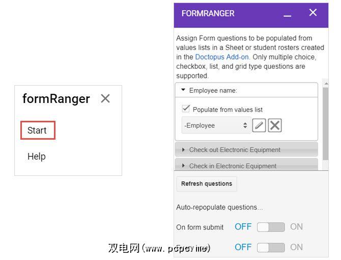 一旦安装了插件,其余的操作就很容易了。创建或打开表单,单击加载项按钮,然后选择 FormRanger 。在弹出窗口中,选择开始开始。然后通过在弹出窗口中选择源,工作表和列来完成每个字段以填充数据。点击下一步,命名您的值列表,然后点击保存并填充问题按钮。就是这样!