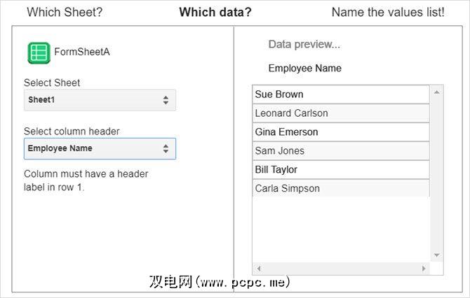 如果您使用表格进行产品订单或员工需要从列表中选择姓名,这是一个很好的数据-映射工具。选择数据源后,只需从电子表格中选择特定的工作表和列即可解决问题。