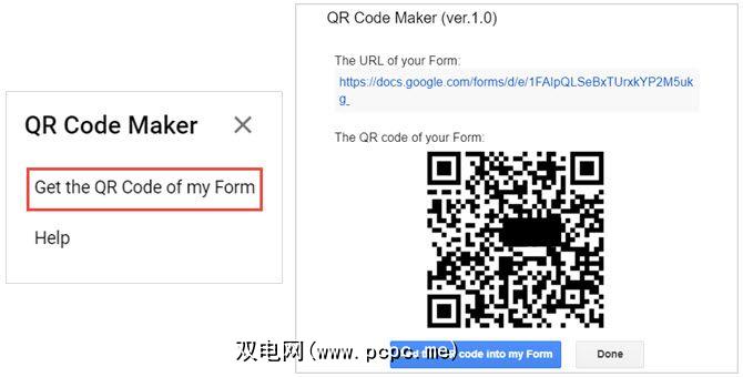 一旦安装了插件,设置就很简单。创建或打开表单,点击附加组件按钮,然后选择 QR Code Maker 。在下一个窗口中,选择获取我的表单的QR码。然后,您的QR码将与表单的URL一起显示在弹出窗口中。