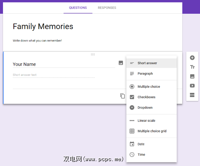 首先登录您的Google帐户,然后转到drive.google.com。在这里,点击新建>更多> Google表单>空白表单。给表格一个标题。我使用“家庭回忆"是因为我觉得任何更正式的内容(例如“家庭树问卷")似乎都太正式了,并给订婚带来了不必要的障碍。您可能也想添加一个令人鼓舞的描述。