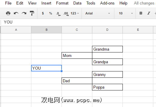 下一步,请回想一下使用Excel作为家谱的粗略轮廓的想法。然后看看这个Google表格模板,您可以使用它来绘制三代血统。