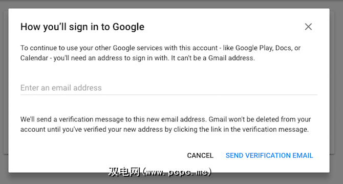 < strong>第一种选择是删除 just 您的Gmail帐户。如果选择执行此操作,则您需要准备好另一个电子邮件地址,以便继续使用与您的Google服务相关的服务Gmail帐户(例如Google云端硬盘和日历)。该电子邮件不能是Gmail地址。