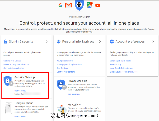 有与Google绑定的众多服务(例如云端硬盘,YouTube,照片等),明智的做法是确保您的帐户不是易受攻击的目标。为此,您可以访问Google帐户设置页面。如果需要,请登录,然后您会看到各种可用的选项。