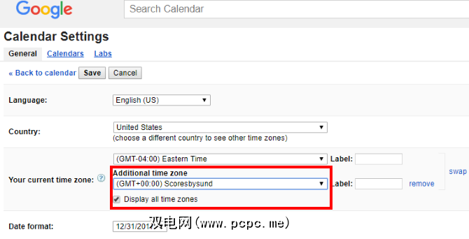 要更改所有日历的时区,请打开Google日历,单击齿轮图标,然后选择设置。在显示您当前时区的地方,只需将下拉菜单更改为您所在的时区即可。