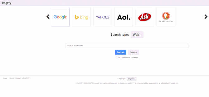 对于新手,您还可以选中一个包含“互联网解释器"的框。解释说搜索引擎可以让您在互联网上搜索信息。 LMGTFY再次居高临下,因为它在搜索后包含“那么难吗?"消息。幸运的是,它现在已用作教育资源,您可以使用它来向人们展示如何自己使用互联网。
