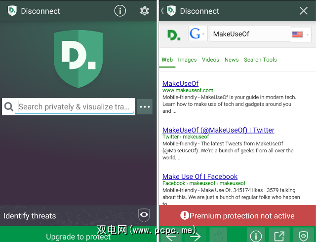 在Android系统上,免费版本的Disconnect具有两个主要功能:屏蔽搜索,以及有关秘密跟踪元素的信息。