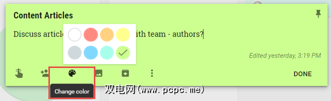 颜色编码是帮助您整理Google Keep记事的最好的功能之一。除了标准白色之外,您还可以选择其他七种颜色之一。对于项目,这非常方便,因为您可以将与一个项目相关的所有音符颜色编码为相同的颜色。然后一目了然,您可以在需要时快速查看所需的内容。