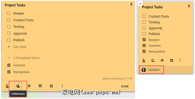 该便笺将显示在其Google Keep主页上。他们对便笺所做的编辑将自动更新,以供您查看,同时便笺上的 Updated 指示符也是如此。您和您的协作者可以将项目标记为完成,并立即查看谁完成了任务。