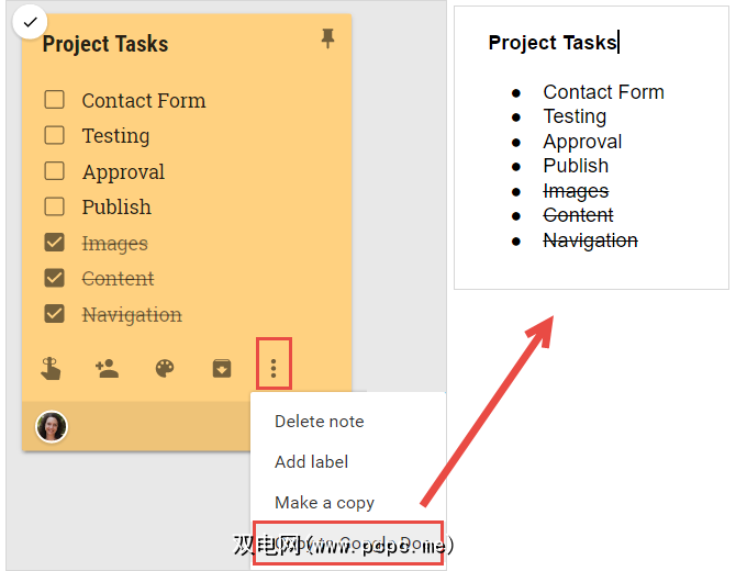 要快速将笔记转换为文档,您可以将笔记复制到Google文档中。点击注释上的更多(三点)图标,然后选择复制到Google文档。将显示一个弹出框,让您立即在新选项卡中打开该项目。然后,您会看到为您复制的便笺,列表或图像。