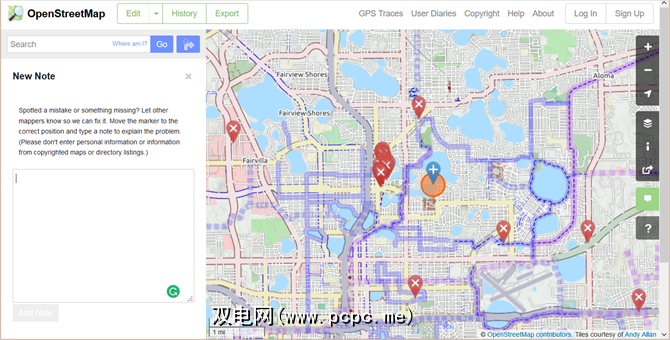 如果您注意到地图上的错误或认为它丢失了某些内容,则可以添加注释。为此,请放大地图上的确切地点,然后点击右侧的 Note 图标。在框中输入您的笔记,并确保不要使用个人信息。然后其他用户将看到您的注释,您也可以看到其他人添加的注释。
