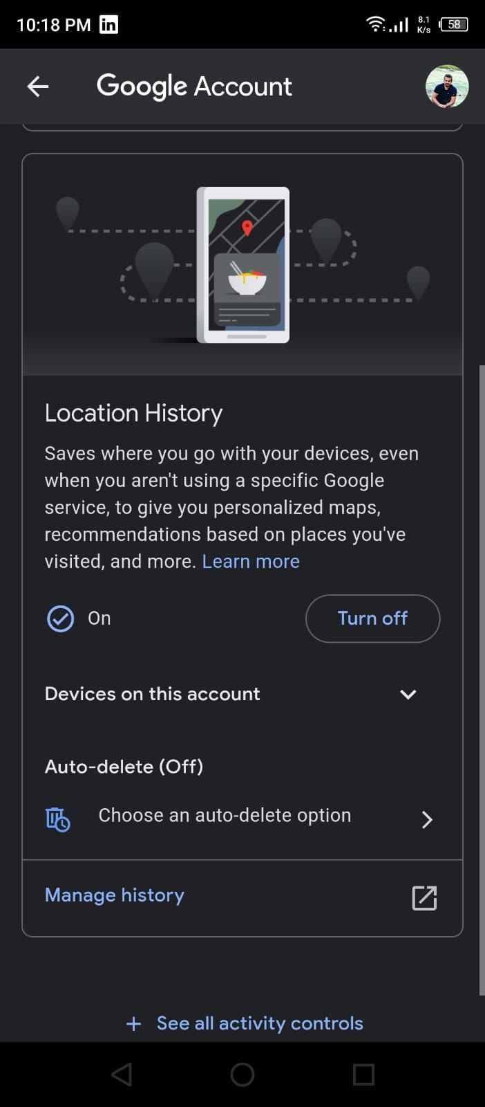 它与其他 Google 服务共享您的位置数据以显示相关内容和广告。您可以通过关闭此选项来阻止 Google 在其应用中持续跟踪您。您还可以启用每 3、18 或 36 个月自动删除您的位置历史记录。