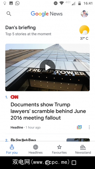 该应用程序在顶部显示您的简报。该简报包括五个新闻故事,它们是新闻算法认为与您最相关的新闻,还有天气预报。