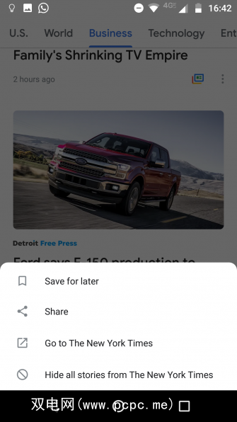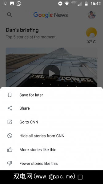 对于您看到的每个故事,您都可以告诉Google新闻以类似的方式显示更多或更少的内容。您还可以阻止某个出版物在您的供稿中弹出。