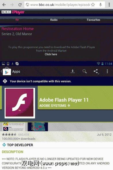 Flash不再包含在4.1 JellyBean中,并且访问了BBC例如,iPlayer网站将显示一条消息,提示您安装Flash。在Android Market上,您无法安装Flash,因为此设备不支持Flash。此外,没有特定的Android版本的BBC iPlayer应用程序像iOS上那样。这样做的结果是明显缺少了一些东西,这是一个很好的例子。