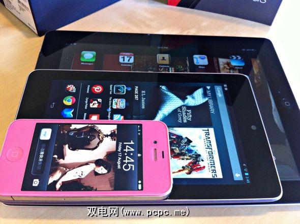 我必须承认,7英寸是一个不错的尺寸。使用iPad,您可以有效地束缚尴尬的境地;您只能用一只手握住它一会儿。是的,更大的屏幕可提供更身临其境的体验,但是您需要坐下来或将设备安装在某个地方,这是一个限制因素。为了进行尺寸比较,以下是iPhone,Nexus 7和iPad: