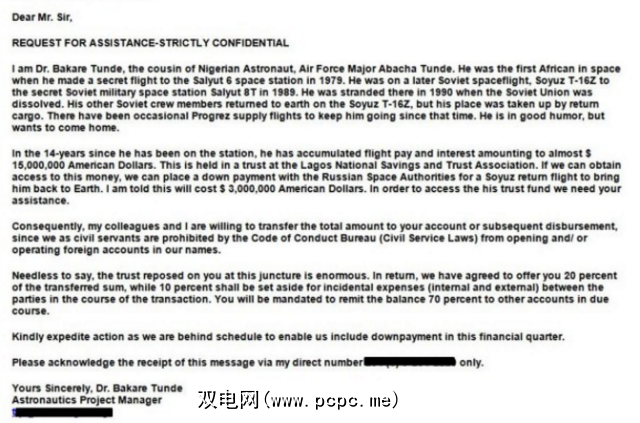 尼日利亚骗局,也称为预付款骗局或419骗局。几乎和互联网一样长。从本质上讲,它们涉及一封电子邮件,该邮件承诺为帮助某人提供大量现金奖励。需要注意的是首先需要向另一个方向汇款。可以说,这笔钱只能往一个方向流动,承诺的付款永远也不会到达。