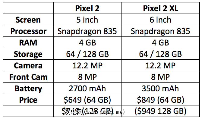 在屏幕和屏幕旁边电池方面,Google在新的Pixel 2手机中进行了一些重大改进和补充。快速浏览一下这两款手机的重要规格: