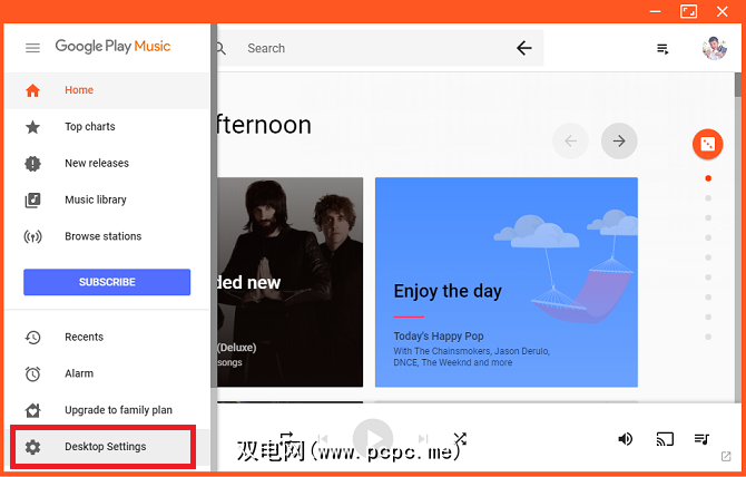 如果您想在可用的地方打个招呼,请展开GPMDP窗口左侧的菜单,然后单击桌面设置。