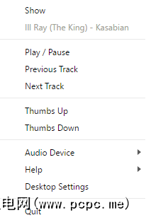 GPMDP在系统任务栏(Windows)或Dock(Mac)中放置一个图标。该图标表示即使关闭主GMPDP应用程序,音乐也可以继续播放。它还使您可以播放/暂停,跳过曲目,为歌曲分配上/下拇指以及更改音频输出设备。