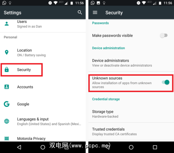 现在有了APK文件,您将需要在您的设备上进行一些更改,然后再进行安装。转到设置>安全,并确保已打开允许从未知来源安装应用旁边的切换开关。