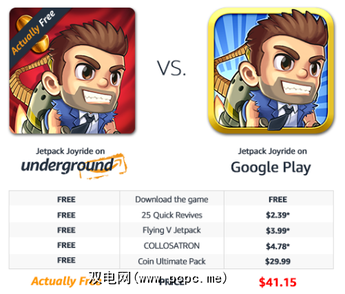 亚马逊在其网站上以Jetpack Joyride游戏为例进行了说明。该公司声称,整个游戏在Google Play上的售价为41.15美元。您可以在下面看到比较的细分: