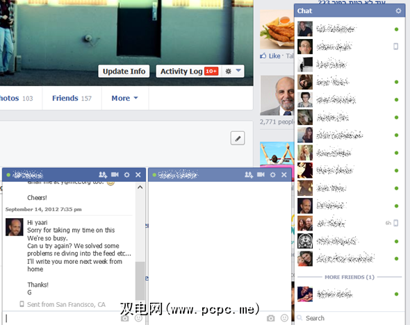 Facebook 的聊天会显示在Facebook边栏中,其中还包括新闻自动收录器,如果您选择禁用它,则作为可折叠窗口。很容易看到谁现在在线上以及谁在移动设备上可用。您还可以搜索未出现在列表中的任何朋友并向他们发送消息。