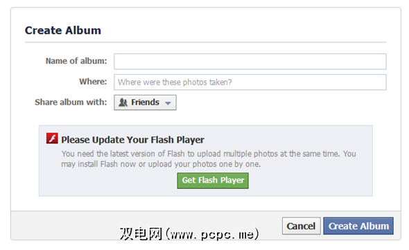 在这里, Facebook 还是有点落后。首先,Facebook的照片上传器需要Flash,如果您选择不将其安装在浏览器中(例如,如果您使用像我这样的Firefox),则必须使用其他浏览器。