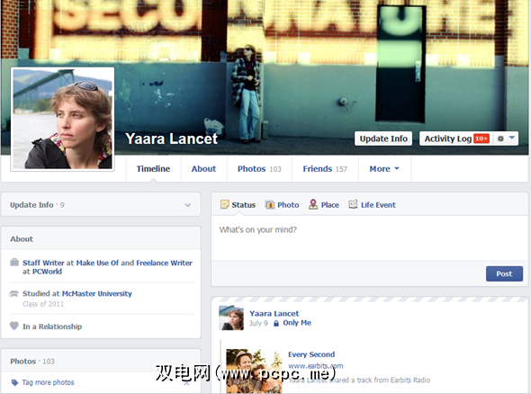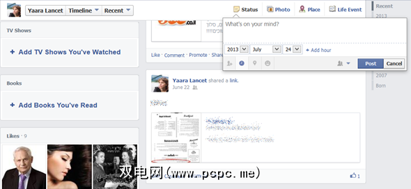 当您向下滚动时,情况会有所变化您的时间表。首先,一旦您经过左侧的广告,您的实际时间表就会突然出现,让您按年份浏览个人资料。顶部工具栏发生了另一个变化。您在封面图像下看到的标签栏不是粘性的,而是一个不同的标签栏,其中一个选项卡包括“时间轴"和“关于"页面之间的切换,以及一种发布新状态,照片,地点或生活事件的快速方法。