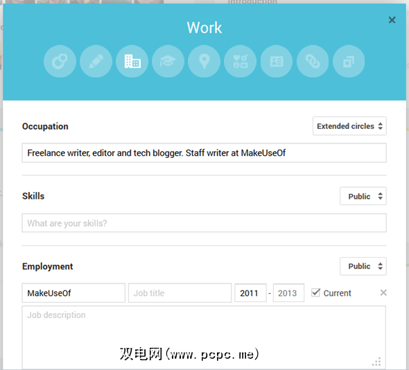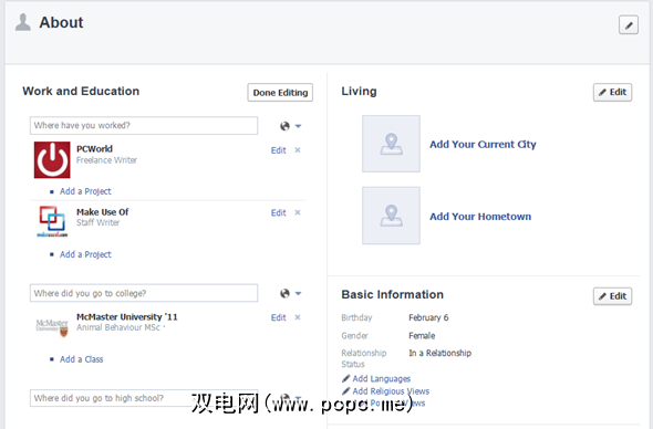 类似于Google+,您可以更改封面图像和或个人资料图片,然后转到关于标签以编辑其他信息。编辑过程在“关于"页面本身上完成:单击要编辑部分的“编辑"按钮,并当场添加信息。再次单击“编辑"以更改现有信息。没有弹出窗口和选项卡可以浏览。