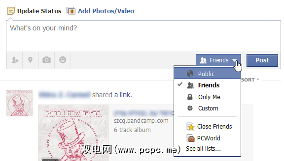 每个更新都可以具有位置和心情,您可以通过单击头部图标或使用@符号来标记用户。对于谁看到您的帖子,这取决于您是否使用Facebook列表。通常,您可以在“公开",“朋友",“只有您",“自定义"(在单独的窗口中打开)和列表之间进行选择。即使您使用列表,也无法与多个列表共享一个帖子,您必须选择一个。您无法从此处控制评论或分享到帖子。