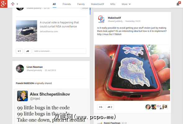 Google+ 自2011年6月推出以来,已经经历了许多界面更改,而现在已经相当流畅了。您的新闻流是非常可定制的,具有两种不同的布局可供选择,并且可以根据您的圈子轻松进行过滤。可以很容易地看到已经为某篇文章+1或分享过多少人,并且每篇文章底部的小头像都可以让您瞥见这些人是谁。