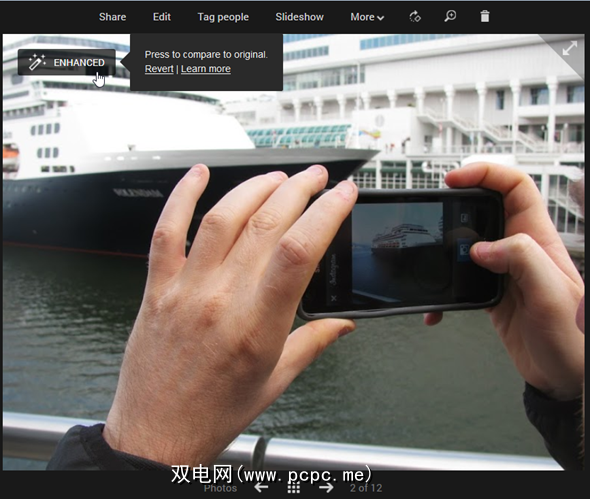 然后如果需要,可以使用特殊向导为照片中的人物添加标签,然后打开共享向导,让您与希望的人共享新相册。默认情况下,您添加的照片会由Google自动增强,但是很容易查看原始版本并根据需要还原为原始版本。