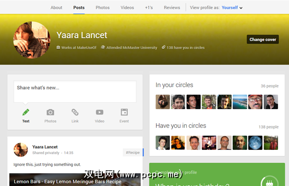 您的个人资料分为不同的标签:“关于",“帖子",“照片",“视频",“ + 1"和“评论"。您可以通过设置来控制访问者可以看到哪些选项卡(搜索“选项卡"一词以找到它。稍后会进一步介绍)。 “帖子"是默认的查看选项卡,从这里只能更改您的个人资料图像,封面图像,并等待它更改名称!考虑到我们听说过的Facebook姓名fiascos,像这样更改姓名的能力令人印象深刻。不过,您不能经常这样做,它会在整个Google帐户中更改您的名称,因此请当心。