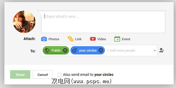 与谁分享信息非常容易控制。只需开始输入圈子或特定朋友的名称以添加他们,或者从下拉菜单或朋友浏览器中选择即可。您还可以通过单击来禁用对帖子的评论和转发,通过电子邮件将更新发送到您的圈子,并使用@或+符号在更新中标记朋友。
