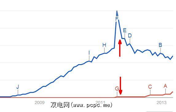 让我们看看搜索趋势在说些什么。要显示这些趋势有多有趣,只需看看2005年至2012年Google搜索趋势如何塑造MySpace的生命周期即可。