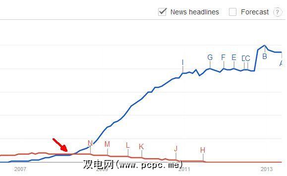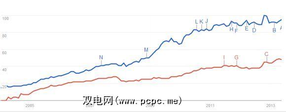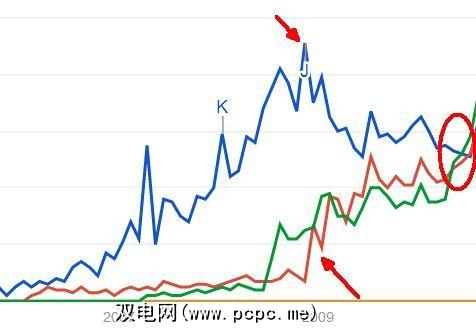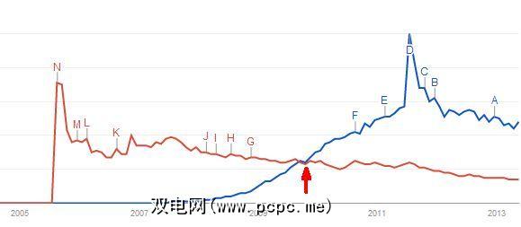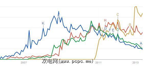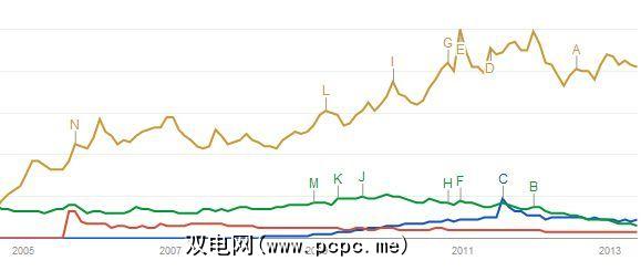 这很可能是因为Yahoo在那个时候创建了一个新的电子邮件界面,并且如果显示Yahoo Mail的搜索趋势,则表明用户必须已经开始离开该位置。 Gmail的趋势似乎暗示着,这些用户中的许多人转而使用了Gmail –也许还有其他在线电子邮件服务。如您所见,这时Google似乎正在赢得这一领域的战争–是吗?