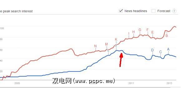 这是搜索趋势可以告诉您的故事的一个非常简单的例子。显然,事后看来是20到20岁,但是如果有人发现Facebook从2007年到2008年逐渐朝着MySpace的搜索兴趣水平下降,该怎么办?直观的观察者本可以利用这些趋势来预测未来-Facebook很有可能取代MySpace成为社交网络强国。