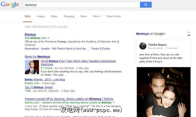 当然,对于Google来说,它最初仅适用于美国和加拿大的用户,因此,我们感谢使用虚拟专用网(VPN)进行了验证。如果您输入搜索字词,比方说最近的艾美奖(#emmys)–您将获得一个新的侧边栏,其中显示了该主题在Google Plus上的讨论(如果有)。