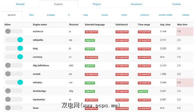 其中包括Google等热门巨头,Bing和DuckDuckGo,以及较小的名称(如Qwant和Startpage)。实际上,您可以为每种类型的搜索类别(即“常规",“文件",“图像",“地图",“音乐",“视频",“新闻"和“社交媒体")选择特定的引擎。