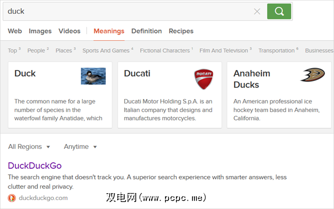 与Google一样,DuckDuckGo在顶部提供类别缩小搜索范围,例如网络,图片或视频。而且,根据您的搜索字词,这些内容可能会从产品,食谱到新闻而变化。搜索引擎还包含几个可以应用的过滤器。