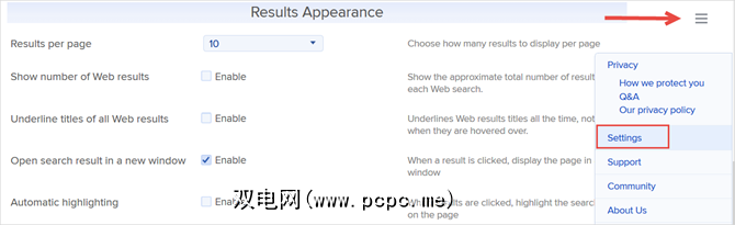 使用StartPage,您的过滤选项显示在时间范围的左侧。可以从右上角的三行图标访问您的设置。您可以调整语言,主题,搜索功能,结果外观和隐私的设置。
