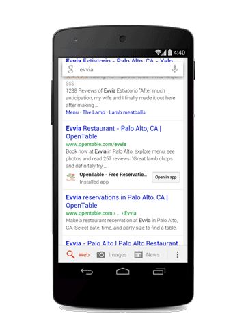 搜索关键术语时,Google搜索将在其中一些显示的旁边显示“在应用程序中打开"按钮(如果已安装)。结果。轻击按钮可将您带到特定应用程序的相关页面。只有结果相关的应用列表才会显示在结果中。目前,支持以下应用程序:AllTrails,Allthecooks,Beautylish,Etsy,Expedia,Flixster,Healthtap,IMDb,Moviefone,Newegg,OpenTable,Trulia和Wikipedia。 Google正在与开发人员合作,以将更多应用添加到列表中。