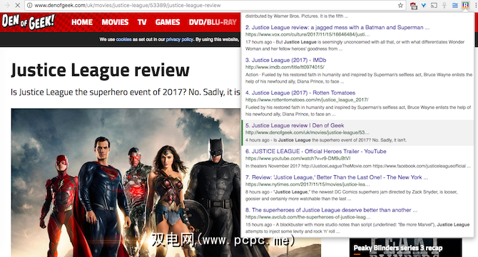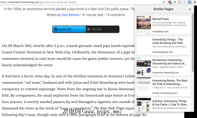 单击“相似页面"扩展程序图标,它将快速搜索与您所在页面相似的页面。您看不到搜索,只能在“相似页面"窗格中看到结果。它为您节省了搜索正确的关键字或词条的麻烦,甚至省去了打开新标签的麻烦。