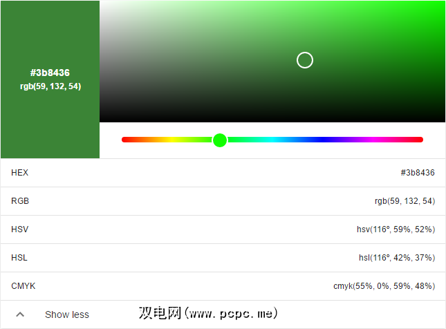 您要做的就是在搜索引擎中键入“ rgb to hex",您会看到该工具。使用颜色选择器找到所需的颜色,它将为您显示RGB,HEX,HSV,HSL和CMYK中的颜色值。