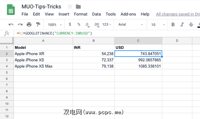 =B2*GOOGLEFINANCE("CURRENCY:INRUSD")确保您不使用实际的货币符号,而是遵循三个字母约定。