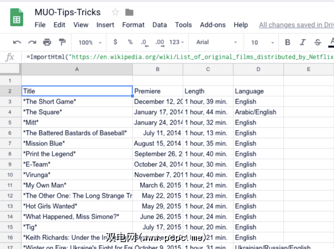 =IMPORTHTML("https://en.wikipedia.org/wiki/List_of_original_films_distributed_by_Netflix","table",4)瞧瞧! Google表格将自动从Wikipedia页面获取表格,格式也不会被破坏。