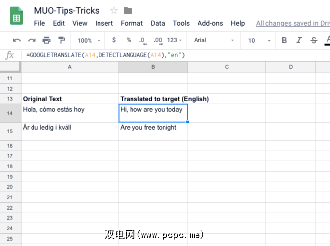 =GOOGLETRANSLATE(A14, DETECTLANGUAGE(A14), "en")作为此语法的一部分,将自动检测“ A14"单元格中的语言并将其翻译为“目标语言"(在这种情况下为英语)。 Google表格上的> GOOGLETRANSLATE 函数不是数组函数,您只需拖动结果并翻译其他单元格即可。