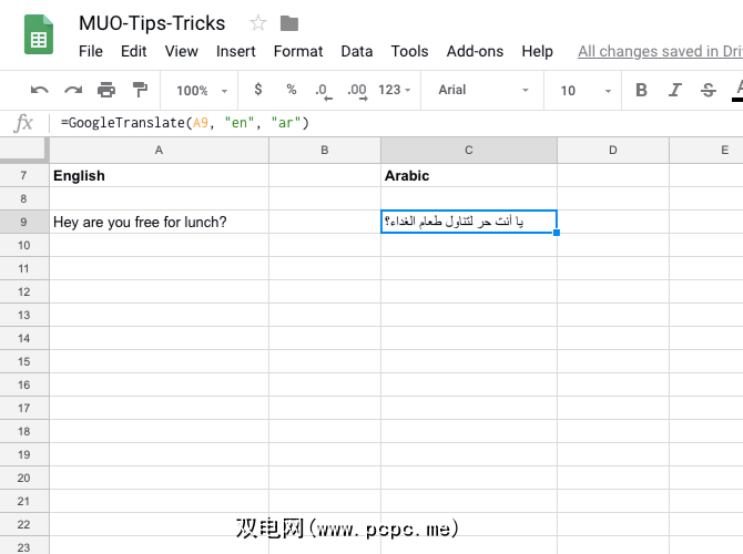 =GOOGLETRANSLATE(A9, "en", "ar")在上面的示例中,我们已将文本(“嘿,您有空吃午饭")从英语翻译成阿拉伯语。如果您不提及“ target_language",Google会自动将单元格转换为默认语言。