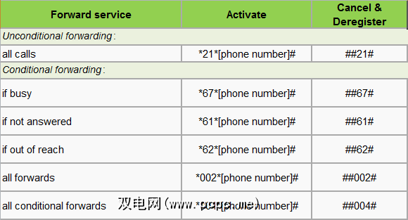 您可以通过找到正确的人机界面来设置条件转发( MMI)代码,然后将其输入到手机的拨号程序中(以下 GSM 代码是维基百科无耻地抄写的)。您还可以通过键入特定于每种转发服务的“取消并注销"代码来消除不再使用的代码。