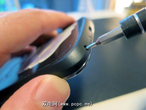 Nexus 4的后半部和前半部通过沿其边缘定位的小钩扣固定在一起。从底部开始,在此卸下螺钉,然后将撬撬插入银色边框和黑色塑料外壳之间。您也可以用指甲开始操作,然后插入撬工具。